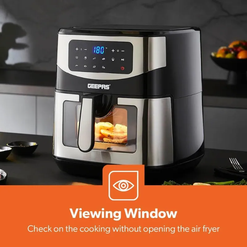 This 9.2L digital air fryer with a rack lets you cook healthy, low-fat meals with up to 80% less oil. It features a digital LED touch screen with 9 preset programs, a 60-minute timer, and VORTEX technology for 30% faster, non-greasy cooking. The viewing window and interior lamp allow easy monitoring, while adjustable temperatures from 50–200°C make it perfect for fries, meat, chicken, cakes, and more. Power: 1600–1800W, AC 220–240V 50Hz, color: black and silver, includes 2-year warranty.